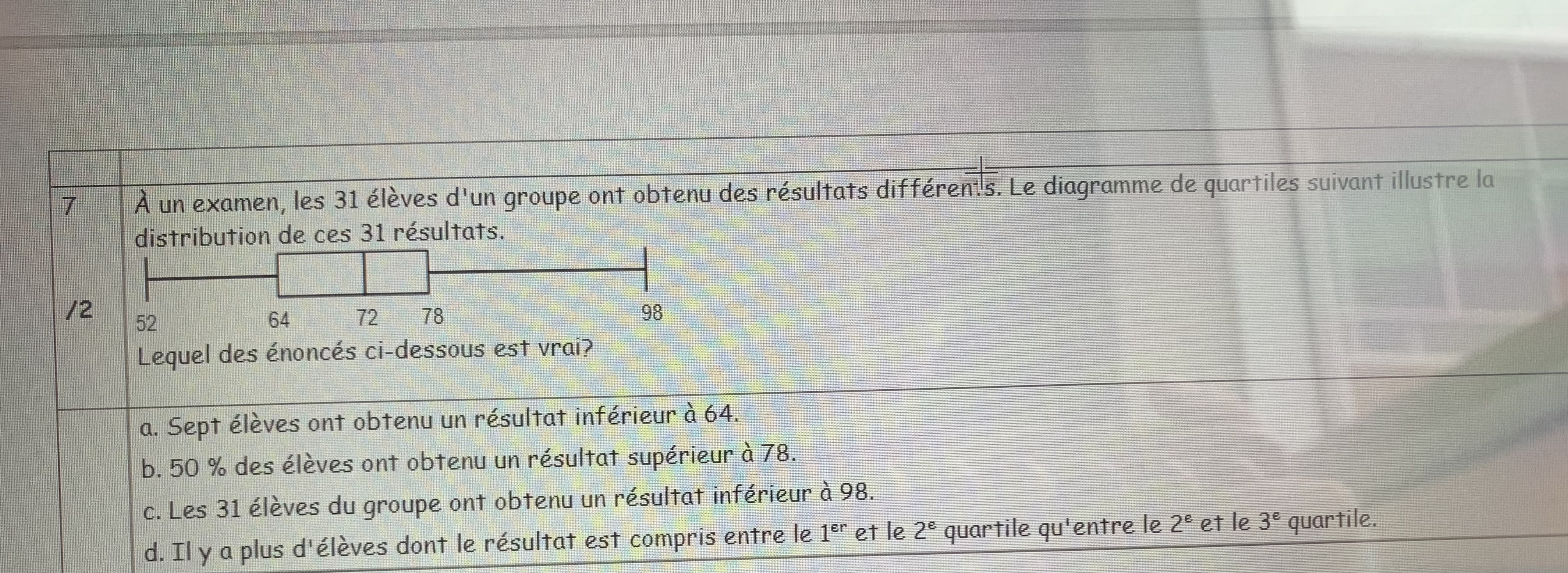 Le 2e quartile représente la médiane de la distribution, c'est-à-dire la donnée centrale. Ici, la médiane est donc de 72. En d'autres mots, la moitié de la classe a obtenu un résultat inférieur à 72, et l'autre moitié a obtenu un résultat supérieur à 72. L'énoncé b) est donc faux. L'énoncé d) est faux aussi, puisqu'on a autant d'élèves dans le 1er et 2e quartile que dans le 3e et 4e quartile.