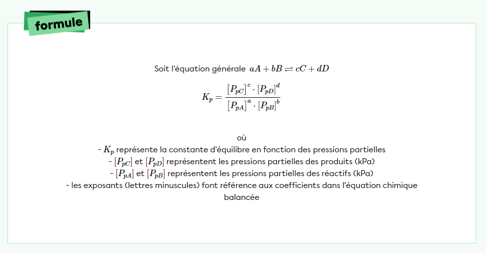 Le Kp est l'équivalent de la constante d'équilibre, sauf que cette constante utilise les pressions partielles au lieu d'utiliser les concentrations.