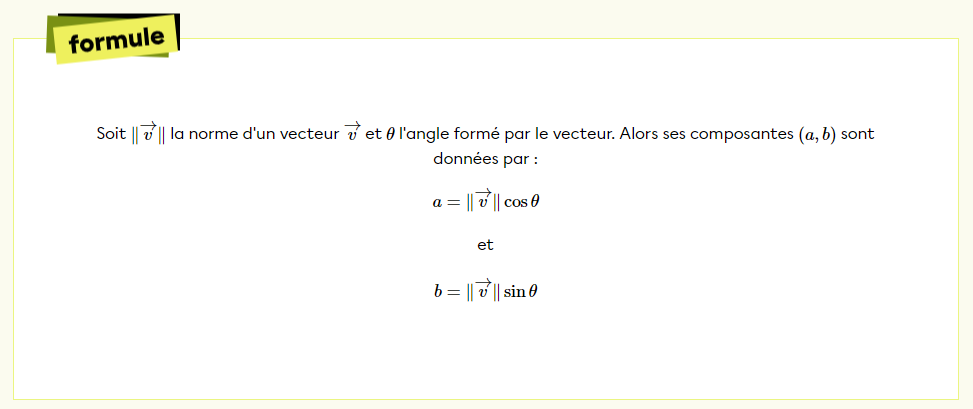 Pour multiplier ton vecteur par un scalaire, tu dois trouver les composantes de ton vecteur. Pour y arriver, tu as besoin de ces formules :