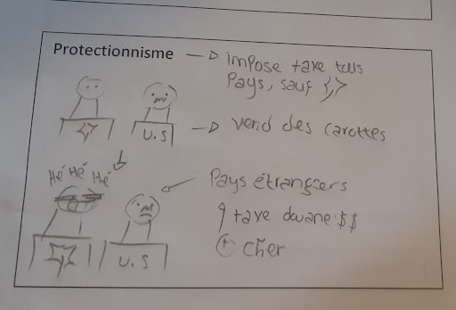 La Grande-Bretagne va imposer des taxes de douanes au pays qui vont vendre des carottes par exemple au Canada. Ça va faire que les gens ne voudront pas acheter les carottes du pays étrangé parce que ceux-ci seront plus élevés.