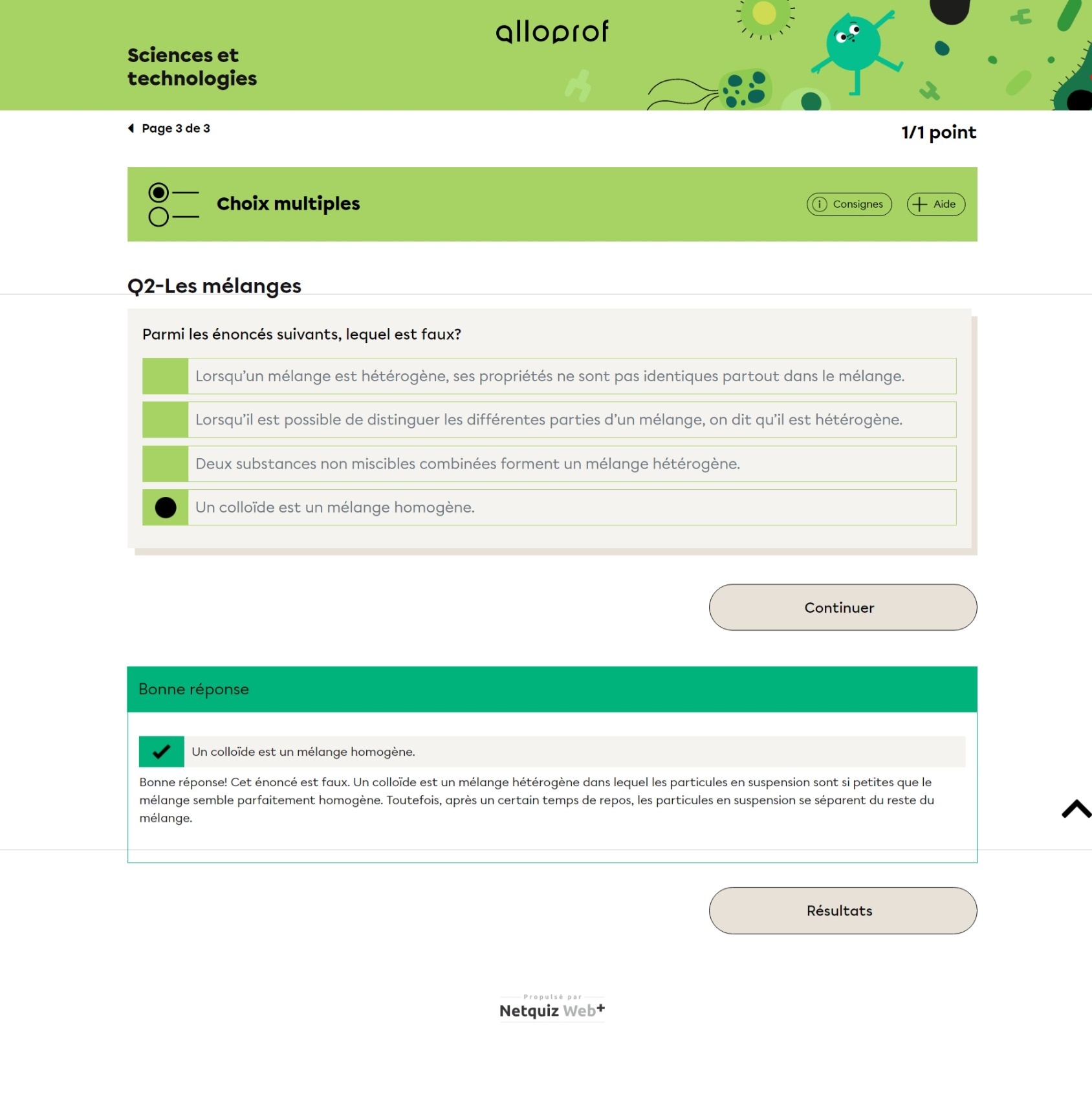 bonjour, ce n’est pas autant une question qu’un avertissement mais je voulais juste informer l’équipe allo prof que l’exercice de pratique dans la section science en technologie secondaire 3, plus précisément les mélanges (Q2) ne fournit pas la bonne réponse à la question! La question demande quelle déclaration est fausse et le programme nous réponds que la réponse fausse c'est qu’un colloide est un mélange homogéne. J’espère que vous pouvez résoudre ce problème bientôt, merci.