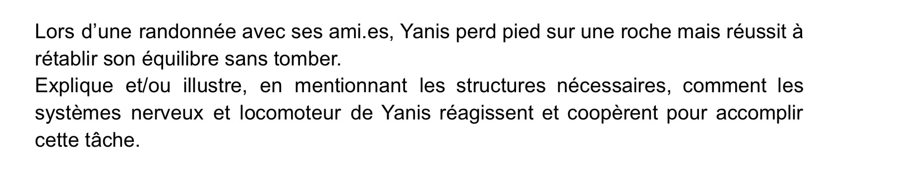 Ma réponse : Lors de la randonnée, Yanis perd pied sur une roche. Lorsqu'il perd pied, il y a un arc réflexe. En effet, lorsque l’organe sensitif qui est le pied envoie un influx nerveux par les nerfs sensitif directement à la moelle épinière. Après avoir reçu l’influx, elle en renvoie un par les nerfs moteurs et par le mouvement des muscles de son pied, il parvient à retrouver son équilibre.