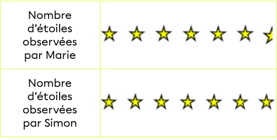 Un diagramme à pictogrammes part du même principe que le diagramme à bandes, excepté qu'il ne contient pas des bandes, mais plutôt des pictogrammes. Un pictogramme est un dessin (une image, comme une étoile) qui représente une certaine valeur chaque fois qu'elle est incluse dans le tableau. Ainsi, cela permet de montrer les quantités d'une observation également. Voici un exemple :