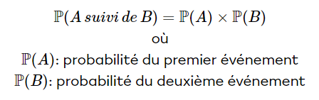 Afin de calculer la probabilité d'un événement sans remise, il suffit de multiplier la probabilité de chacun des événements dans l'ordre :