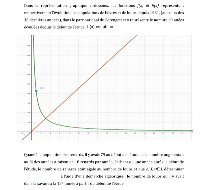 On te dit qu'il y a autant de renards que de loups la première année. Puisqu'on connait la règle de la fonction des renards, on peut donc trouver le nombre de renards qu'il y avait la première année, et ainsi trouver le nombre de loups cette année-là. Tu trouveras ainsi les coordonnées d'un premier point de la fonction des loups \(h(x)\).