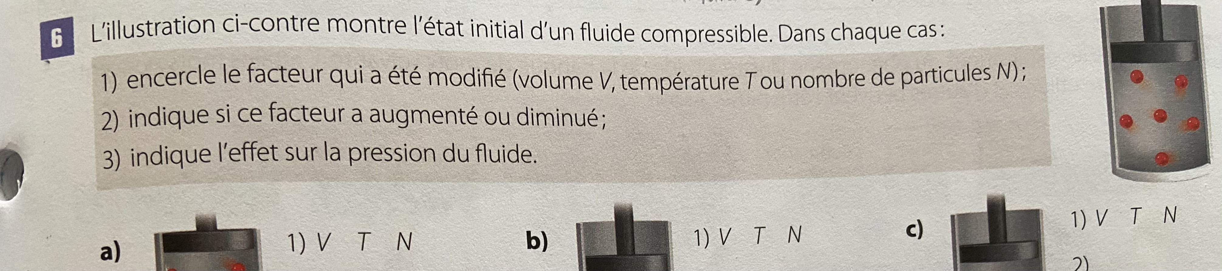 En fait, ce que l’on te demande c’est de dire si la modification a augmenté la pression ou diminué la pression. Par exemple, si je diminue le volume, la pression du fluide va augmenter. Voici une fiche qui pourrait t’aider :