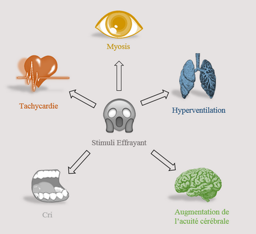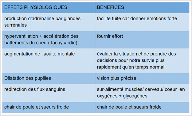 Les effets de la peur sont nombreux sur le corps. En voici un résumé. À gauche, ce sont les réactions du corps et à droite ce qu'elles permettent.