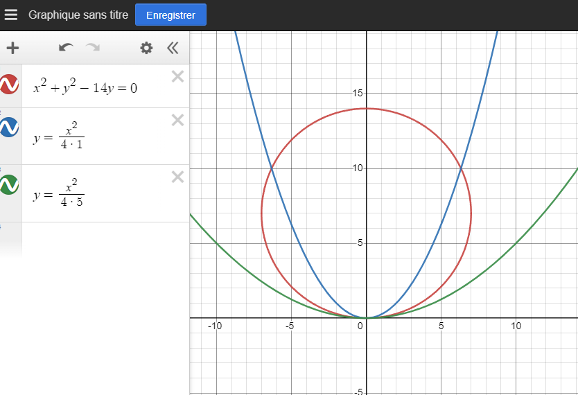 La bleu y=x²/4*1 est obtenue pour a=1, non seulement il y a le point d'intersection O(0,0), tu as deux points d'ordonnée 10, donc au total il y a 3 points d'intersections