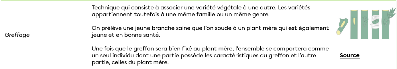 Multiplication artificielle des plantes par les greffes. 3. Fixation sur la chaîne principale d'un polymère de chaînes latérales appelées greffons. (Le greffage permet de conférer une ou plusieurs propriétés à un polymère, tout en lui conservant ses caractéristiques essentielles.)