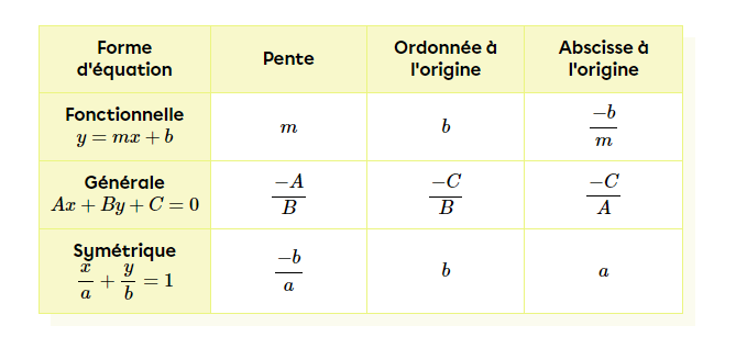 Dans cet exercice, tu dois te rappeler qu'une droite peut avoir plusieurs formes. Voici un tableau qui compare ces formes d'équations.