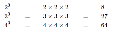 De plus, lorsqu'on multiplie un nombre trois fois par lui-même (donc on lui affecte un exposant 3), le résultat est un nombre cubique. Voici des exemples :