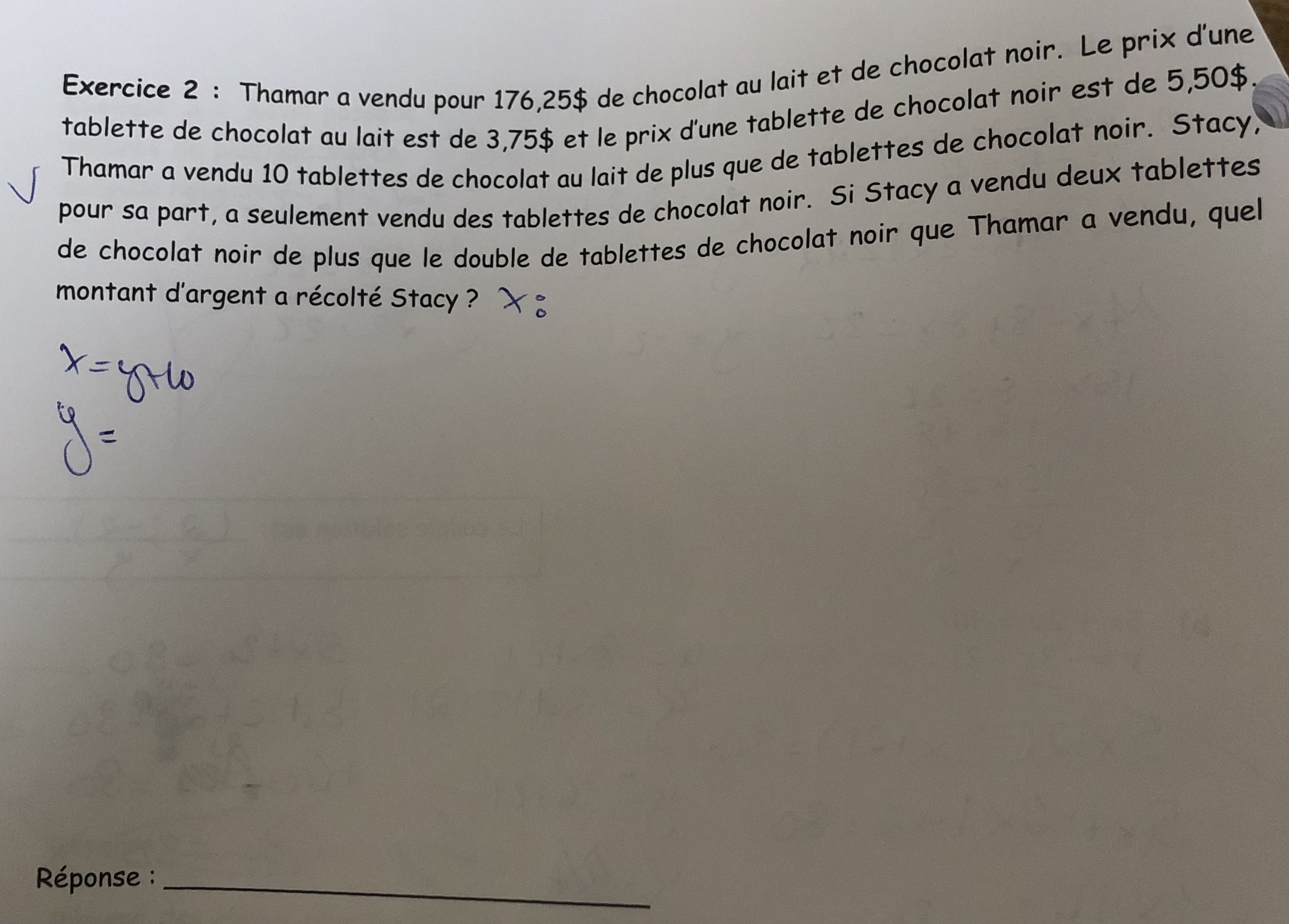 y : nombre de tablettes de chocolat noir vendues par Thamar