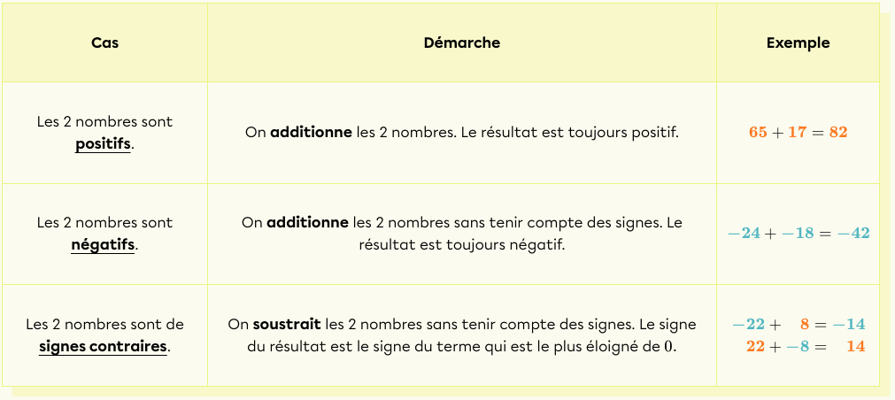 Je suis en secondaire 1 pis je ne comprend pas la règle des signes pour la soustraction. Je suis allé voir la fiche mais je n'ai toujours pas très bien compris. Cependant, j'ai remarqué que pour l'addition, il y avait ce tableau si-dessous qui m'a vraiment aider. En conclusion, voici ce qui pourrait m'aider:
