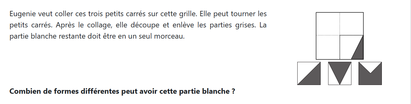 Pour le deuxième exercice, tu pourrais reproduire les petits carrés avec une feuille de papier et les découper. Ça te permettra de manipuler les pièces, et d'observer quelle forme tu peux créer. Chaque fois que tu trouves une forme, dessine-la à part sur une feuille.