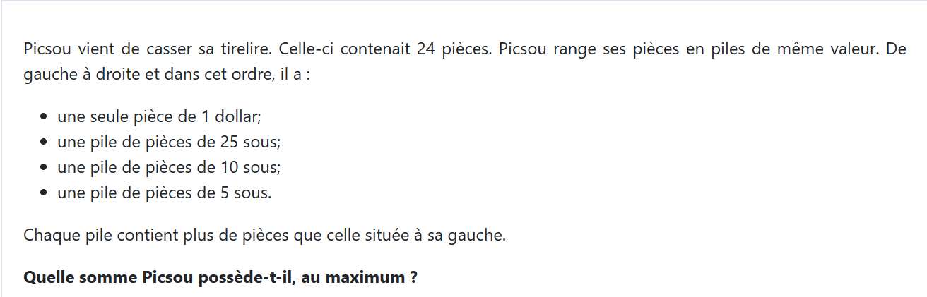 Cela donne bien une somme de 24 pièces (1 + 6 + 8 + 9), et chaque pile en a plus que la précédente.