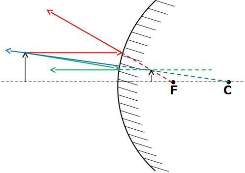 Peu importe où se situe l'objet devant le miroir convexe, les caractéristiques de l'image sont toujours les mêmes. L'image sera toujours virtuelle, droite, plus petite que l'objet et elle sera située entre le foyer et le sommet, tous deux situés derrière le miroir.