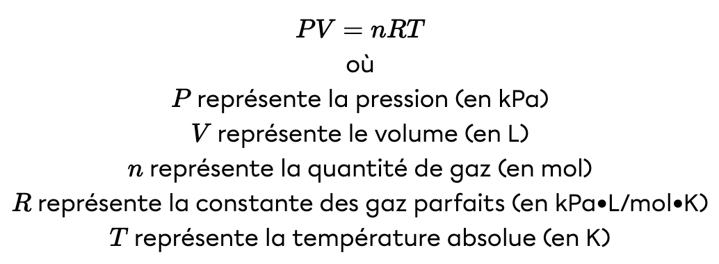 Un gaz parfait est un gaz qui, théoriquement, répond à toutes les lois des gaz, peu importe les conditions de température et de pression, et dont le comportement peut être expliqué par la théorie cinétique des gaz. Par conséquent, la loi des gaz parfaits permet de décrire l'interdépendance entre la pression, le volume, la température absolue et la quantité de gaz en moles à un moment donné. Cette expression peut donc être exprimée par l’équation suivante :