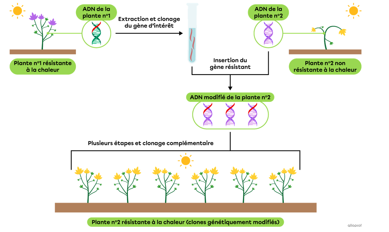 Si une plante donnée est particulièrement résistante à la chaleur, on peut identifier et cloner le gène responsable de cette caractéristique. On insère ensuite le gène cloné dans le code génétique d’une autre plante afin qu’elle soit, elle aussi, plus résistante à la chaleur.