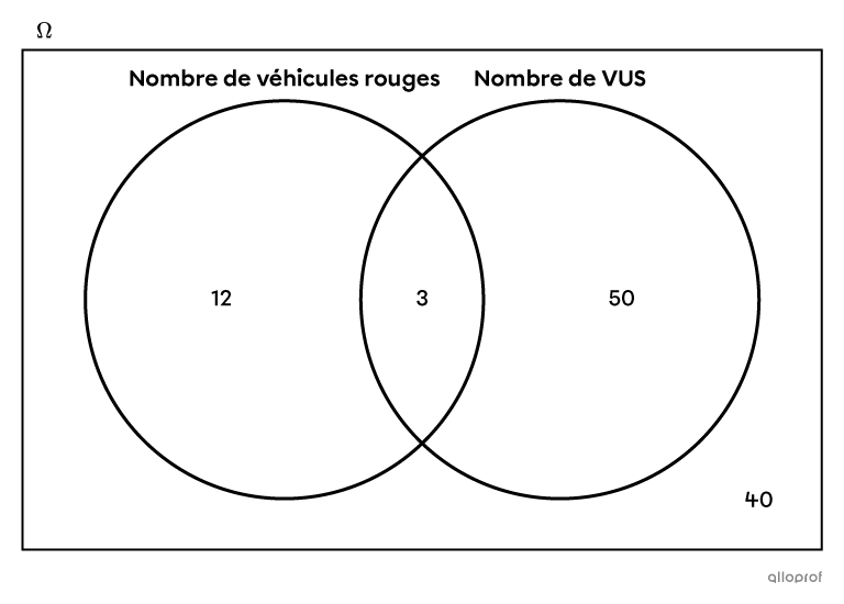 Par exemple, le diagramme suivant nous indique que 40 véhicules sur les 105 véhicules répertoriés ne sont ni un VUS ni un véhicule de couleur rouge. Il est préférable d’inscrire le nombre d’éléments présents dans chaque partie du graphique plutôt que d’y inscrire tous les éléments un par un.