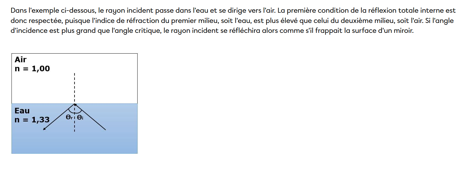 Deux conditions doivent être réunies pour qu'une réflexion totale interne puisse se produire.