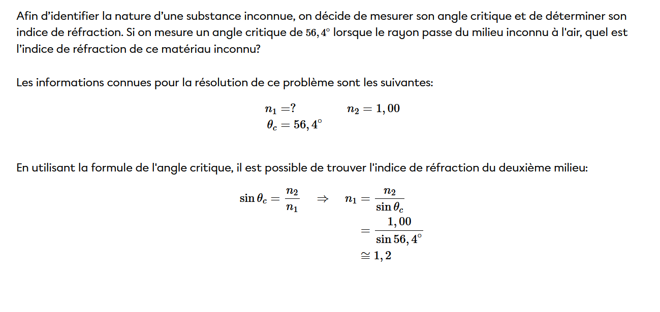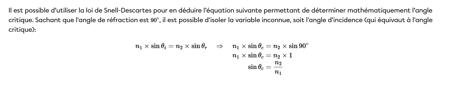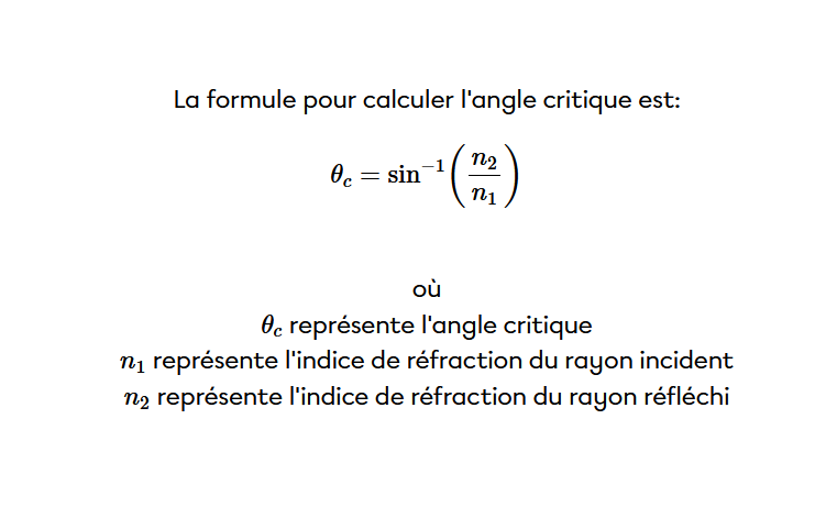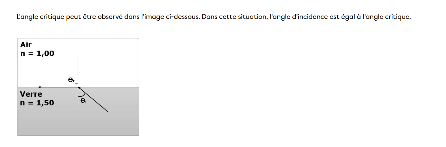 Regardons maintenant ce qu'est l'angle critique. Il nous aidera à déterminer s'il y a une réflexion totale interne ou non.