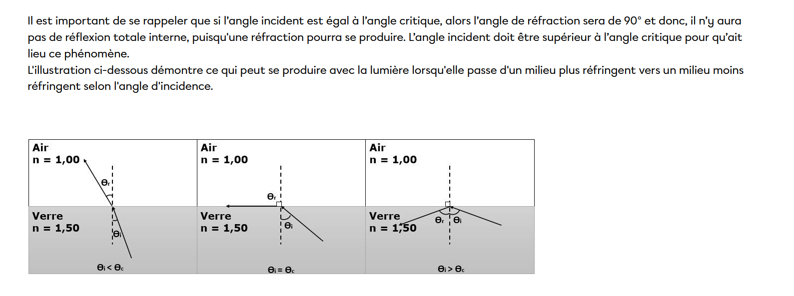 Une réflexion totale interne survient lorsque l’angle du rayon réfracté dépasse 90∘.