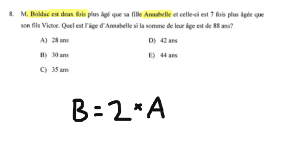 Ensuite, établir l'équation mathématique (formule qu'on va utiliser pour calculer ce que l'on cherche). On fait ça avec les données du problème. En comprenant ce que les mots veulent dire en signes mathématiques (ex. a besoin des deux = addition), on sera en mesure d'établir une bonne équation.