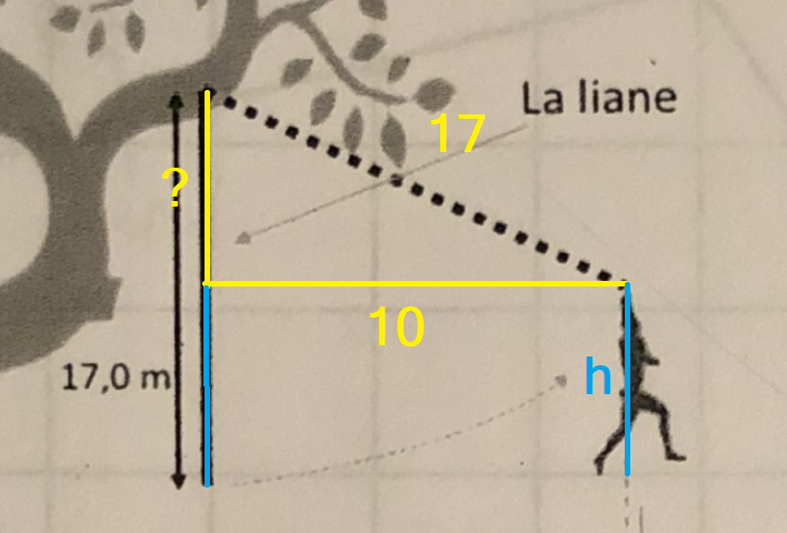(tu peux y arriver avec Pythagore dans le triangle rectangle jaune, puis en soustrayant la mesure de la cathète à 17 m)