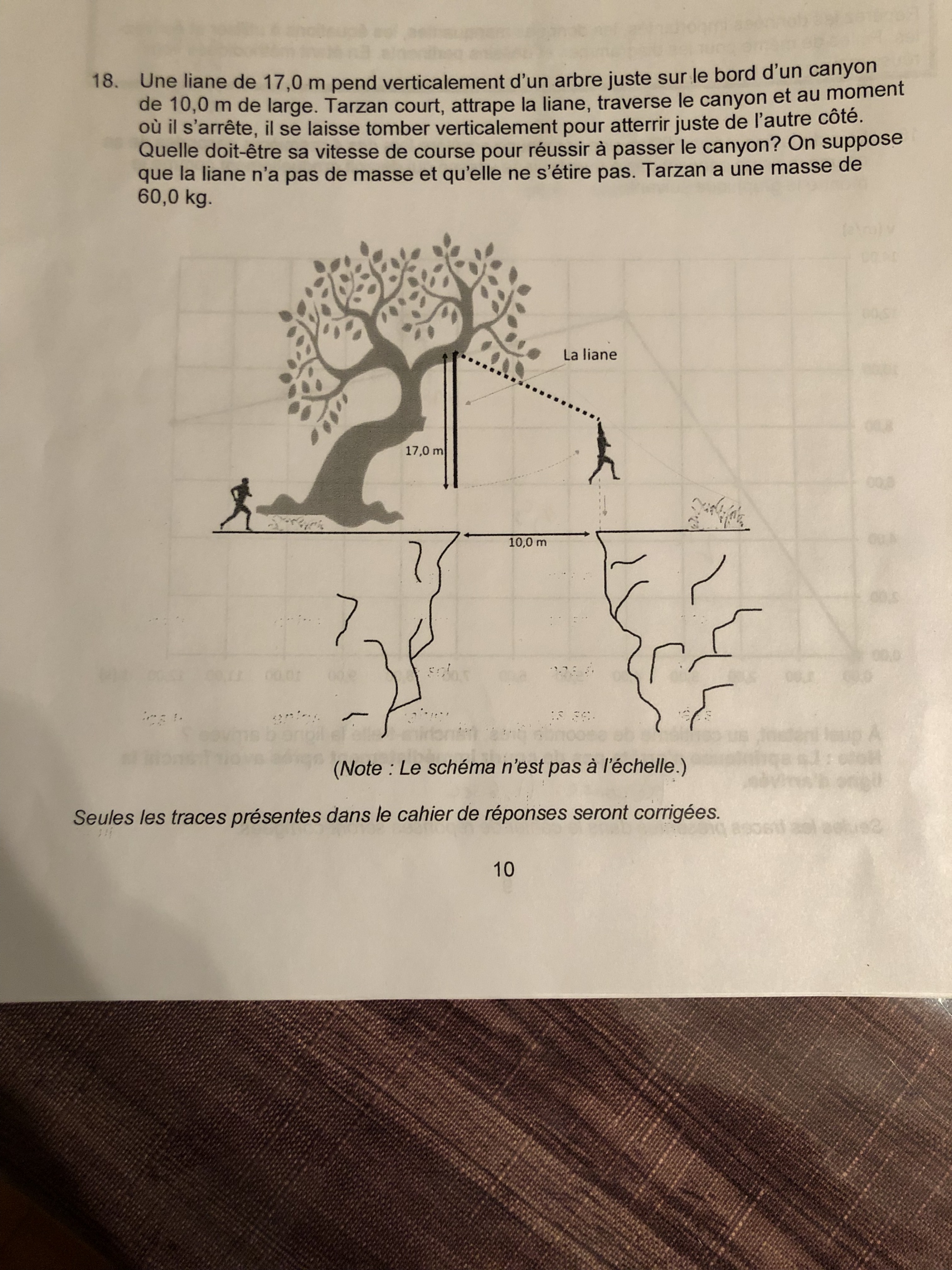 Je ne suis pas certain, mais je pense que tu devrais calculer la hauteur \(h\) à laquelle Tarzan doit se trouver.