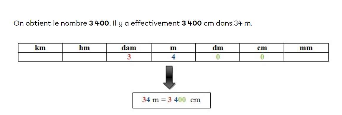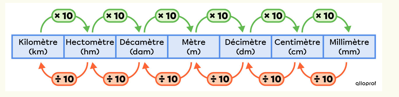 Tu vois que si on va d'une certaine mesure vers une plus petite (ex. cm vers mm), on multiplie, tandis que si on va d'une certaine mesure vers une plus grande (ex. cm vers dm), on divise.