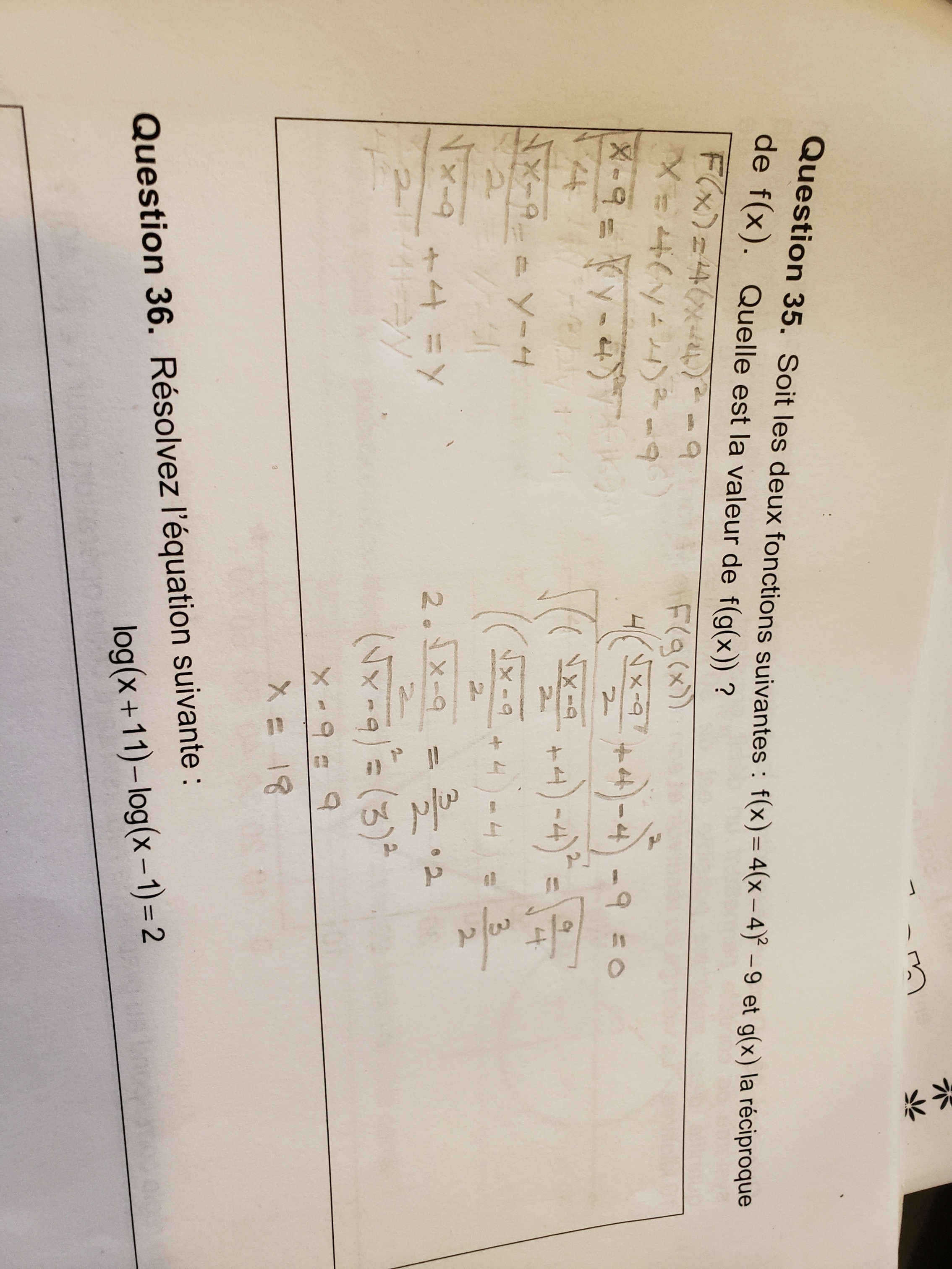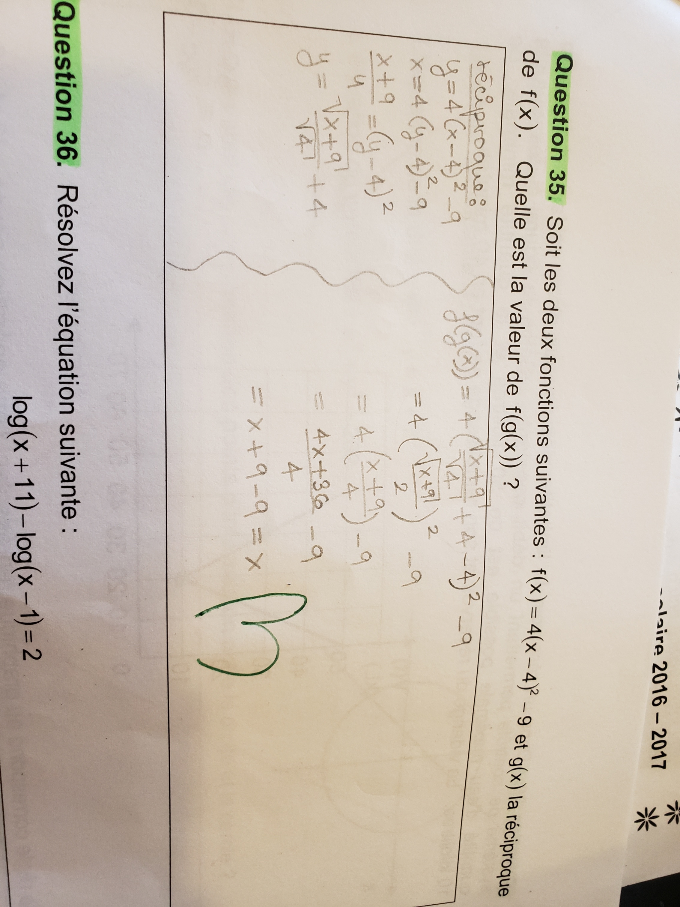 Ensuite, on cherche la valeur de f(g(x)). C'est une composition de fonctions, donc il ne fallait pas poser f(g(x)) = 0, mais seulement simplifier l'expression.