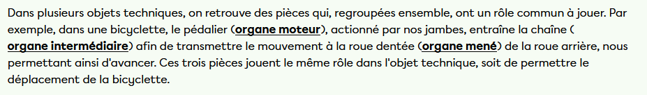 Par exemple, pour le pédalier de tout à l'heure du vélo, le cycliste pédale, déclenche le mouvement à l'aide du pédalier (organe moteur) et la roue dentée reçoit le mouvement pour tourner à son tour (organe mené). Si tu continues plus loin, en observant le mouvement de la roue sur la chaîne, la roue qui commence le mouvement pour la chaîne deviendra l'organe moteur et la chaîne qui reçoit le mouvement deviendra l'organe mené. Tout dépend de quel mouvement on regarde et de quelles pièces on observe.