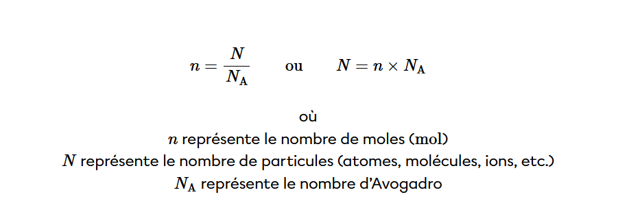 Le nombre d'Avogadro, symbolisé NA, correspond au nombre de particules qui se trouvent dans une mole, soit 6,022 × 10^23 particules. Alors, qu'il y ait un seul gaz ou plusieurs gaz, on pourrait trouver le nombre de particules ou de moles de chacun d'eux à l'aide de la conversion suivante.