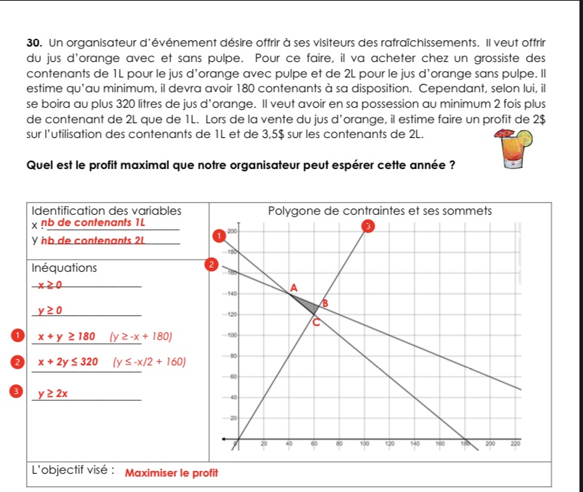 La deuxième contrainte est sur la quantité de jus (en litre).