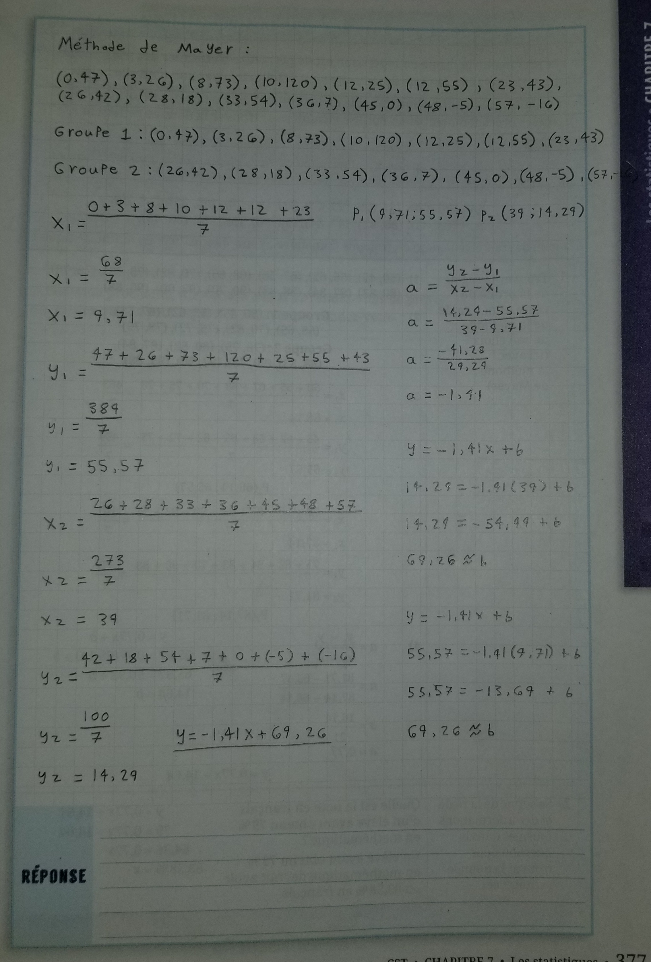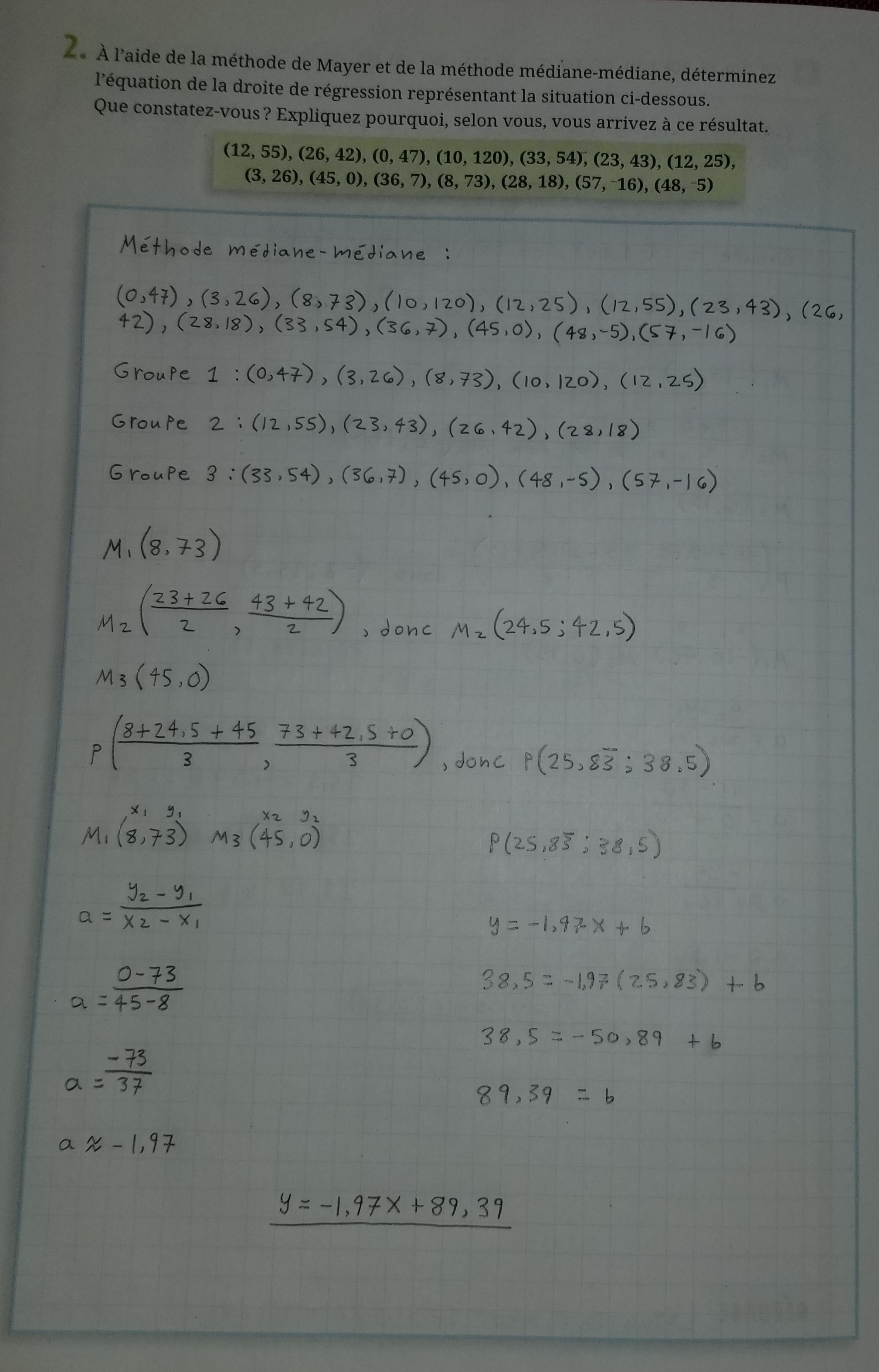 Il me semble que logiquement, en utilisant la méthode de Mayer, je devrais obtenir la même équation que celle trouvée avec la méthode médiane-médiane. Pourtant, en utilisant la méthode de Mayer, l'équation trouvée est plutôt environ y = -1,41x + 69,26 Voici ma démarche :