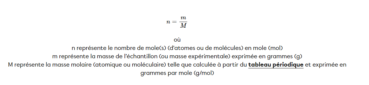 Donc, en effectuant un produit croisé, tu peux trouver le nombre de moles de fer s'il y a 3,01 x 10²³ atomes. Puis, à l'aide de la formule ci-dessous, tu pourras trouver la masse de cette quantité de fer.
