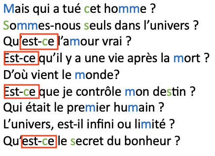 En ce qui concerne la répétition, c'est une figure de style d’insistance qui consiste à répéter un mot, une expression ou un groupe de mots dans différents types de textes. On remarque que les répétitions des mots « est-ce » et « qu'est-ce » insistent sur le questionnement. En ce sens, on peut en effet considérer qu'il y a la figure de style de répétition dans ce poème.