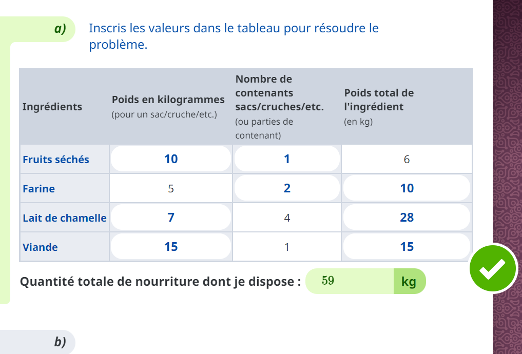 Tes erreurs sont dans les questions de la fin. Relis les bien, on demande pour les cuisiniers et les enfants.