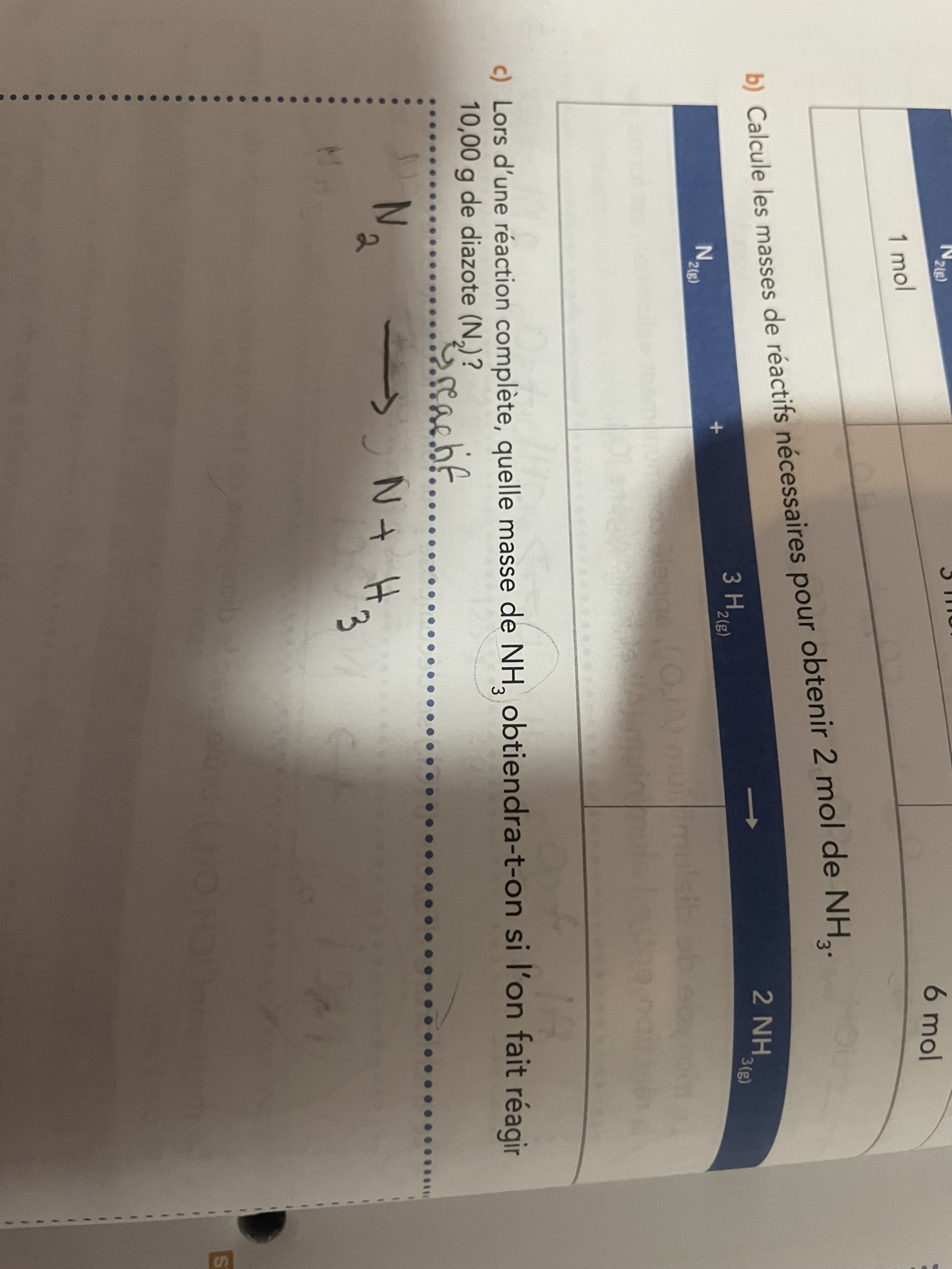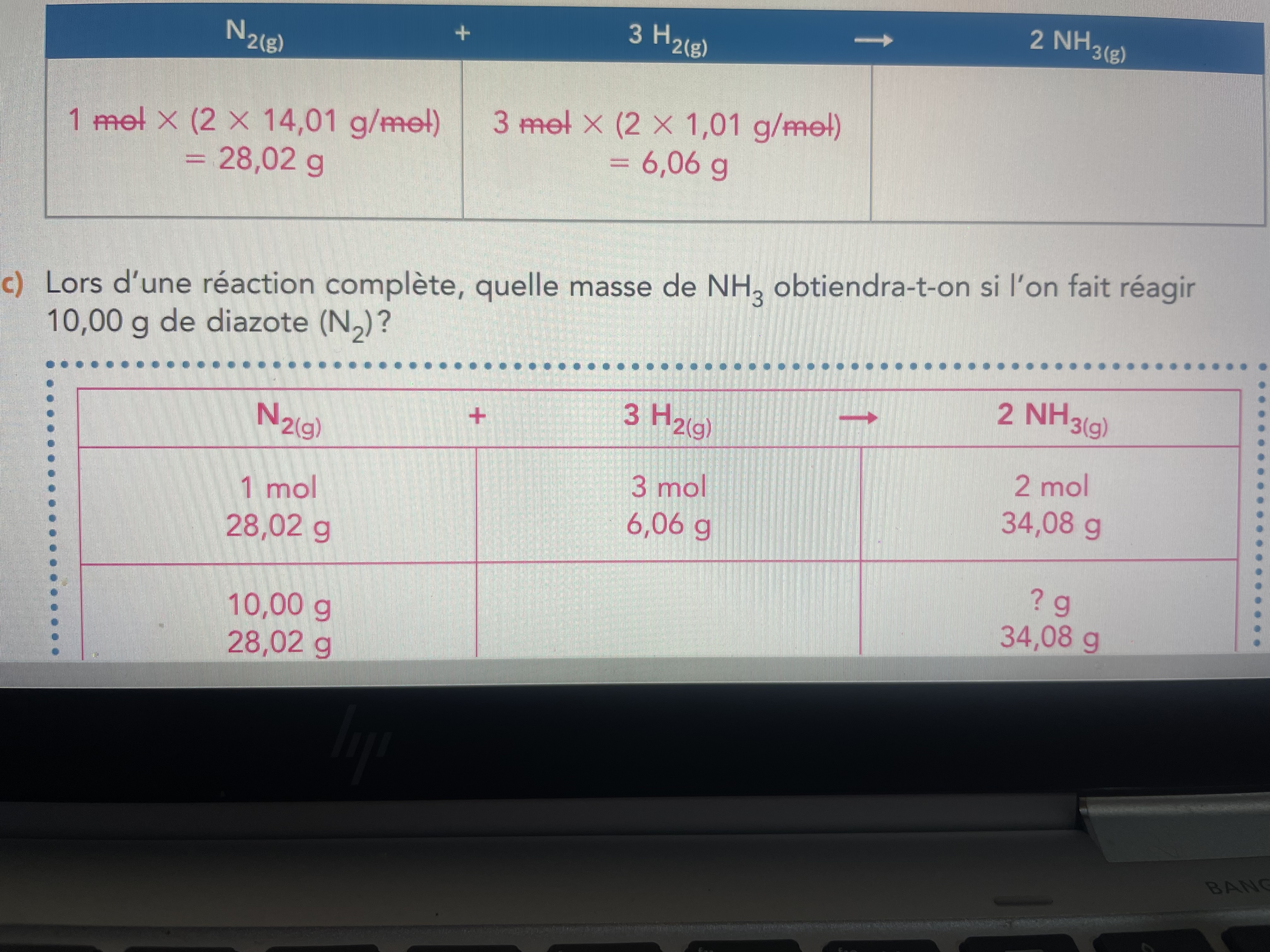 Dans le corriger, ils semblent avoir respecté les molécules (N2, H2 et NH3). Ils n’ont pas modifié leur composition. Dans la stoechiométrie, ce sont les quantités qui sont modifiées. Souvent, il faut donc faire des produits croisés pour trouver les réponses. Faire de la stoechiométrie, c’est comme modifié des recettes continuellement. En fait, c’est comme si nous faisions une recette de riz au légumes et que nous doublions la quantité de riz, il faudrait calculer la nouvelle quantité de chacun des autres ingrédients de la recette nous devrions ajouter afin que notre recette garde le même bon gout.