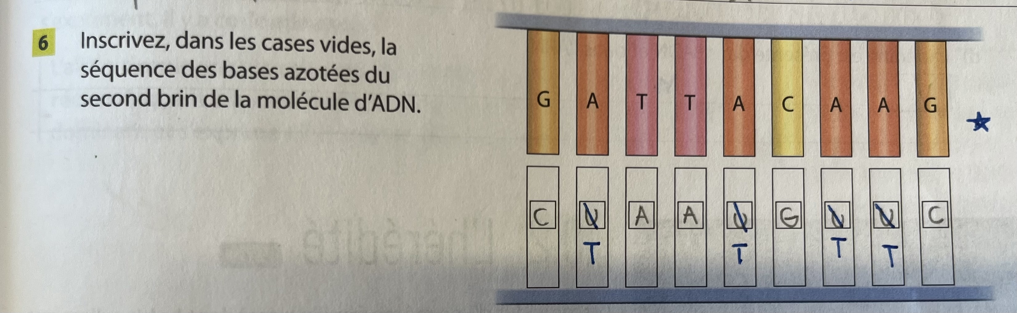 Dans le premier exercice, tu dois faire correspondre des bases d'ADN (pas d'ARN). Il n'y a pas de U dans l'ADN, mais bien du T. Les associations dans l'ADN dont donc G-C et A-T.