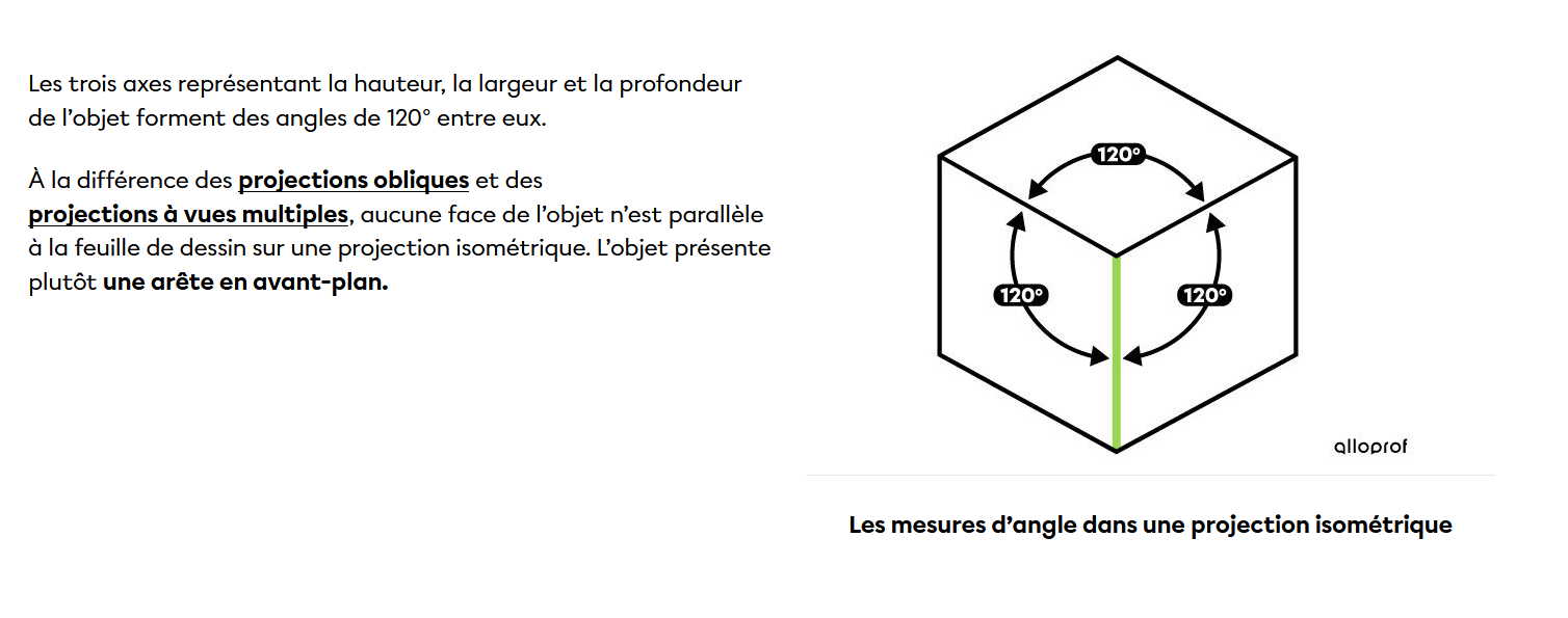 La projection isométrique (ou axonométrique) est une représentation en perspective d’un objet, où les trois arêtes principales (qui correspondent aux trois dimensions de l’objet) forment des angles égaux de 120°.