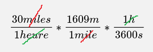 $$\frac{30 miles}{ 1 heure} * \frac{1609 m}{ 1 mile} * \frac{1 h}{3600s}$$