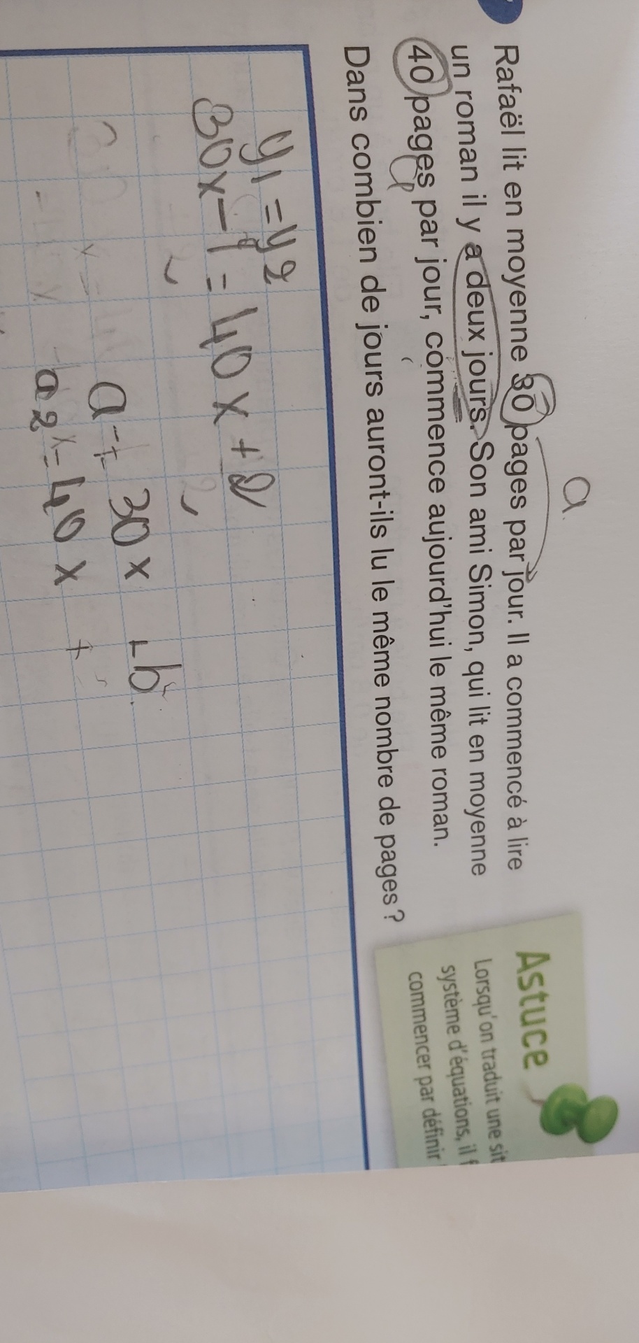 Rafaël : y=30x+60 (car il a déjà lu 60 pages en 2 jours)