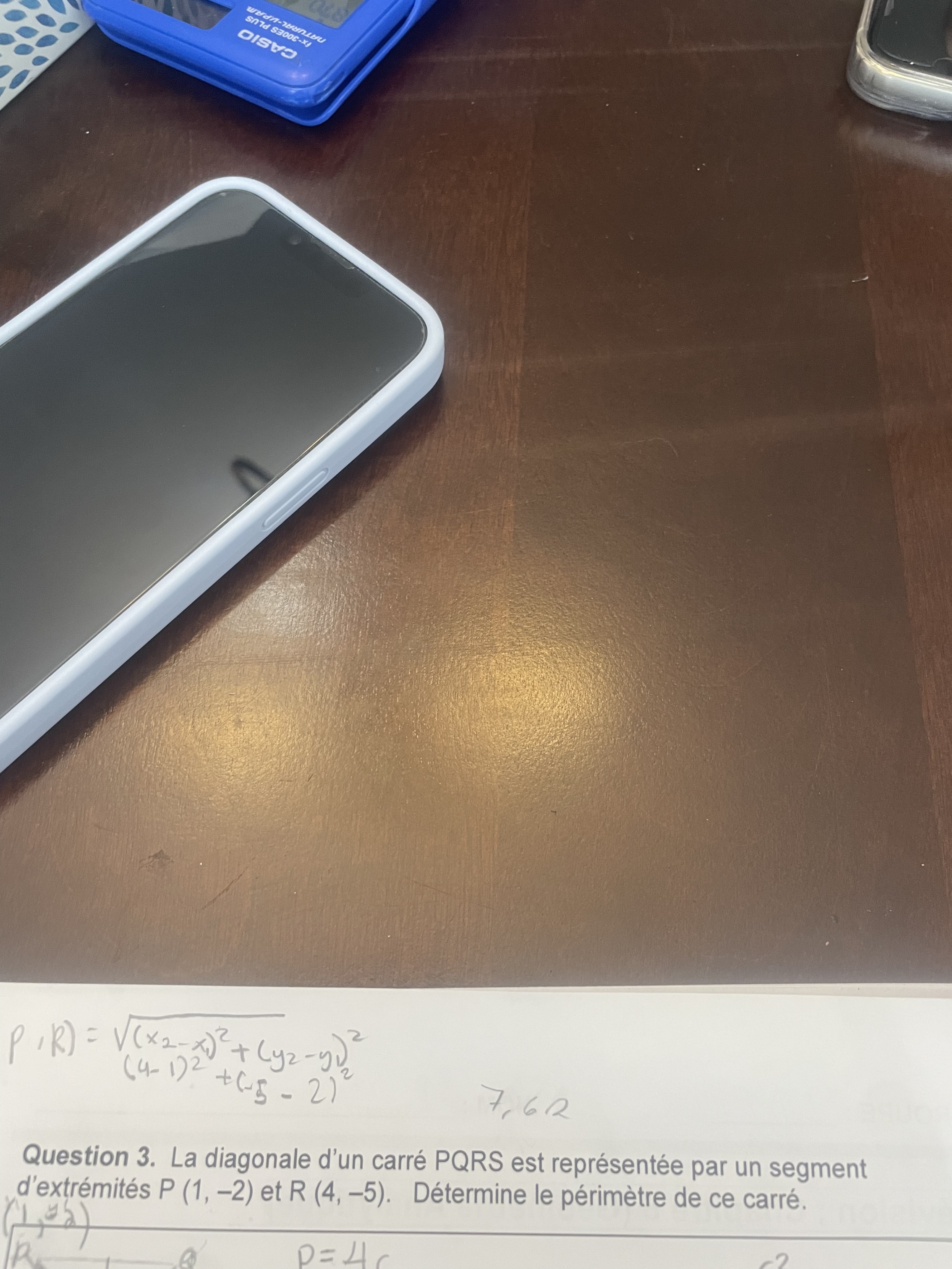 Premièrement, trouve la longueur de la diagonale du carré avec la formule de la distance entre deux points. Je vois que tu l'as fait en haut mais n'oublie pas pour les y tu as -5 - (-2).