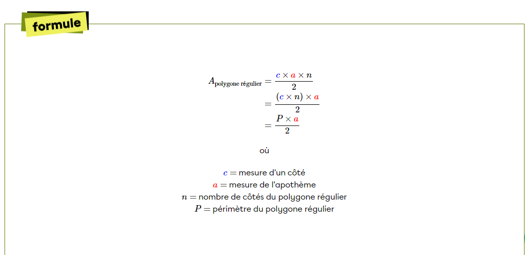 Ensuite pour la figure, il s'agit d'un prisme à base pentagonale, tu dois donc trouver l'aire de la base et la multiplier par la hauteur afin d'obtenir son volume. Tu sais que l'apothème est de 150 mm, que chaque côté mesure 20 cm et que la hauteur du prisme est de 0,05 m. Fais bien attention à tes conversions d'unités! Avec toutes ces informations, tu peux calculer le volume du prisme avec ces formules :