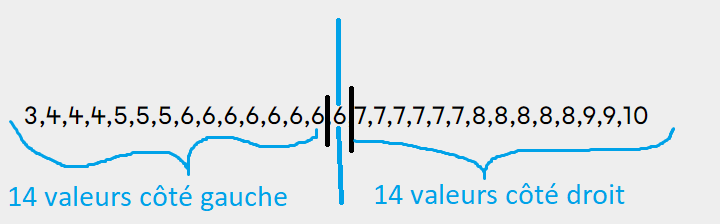 On peut voir alors que le centre de ces deux groupes est le 6. La médiane est de 6.
