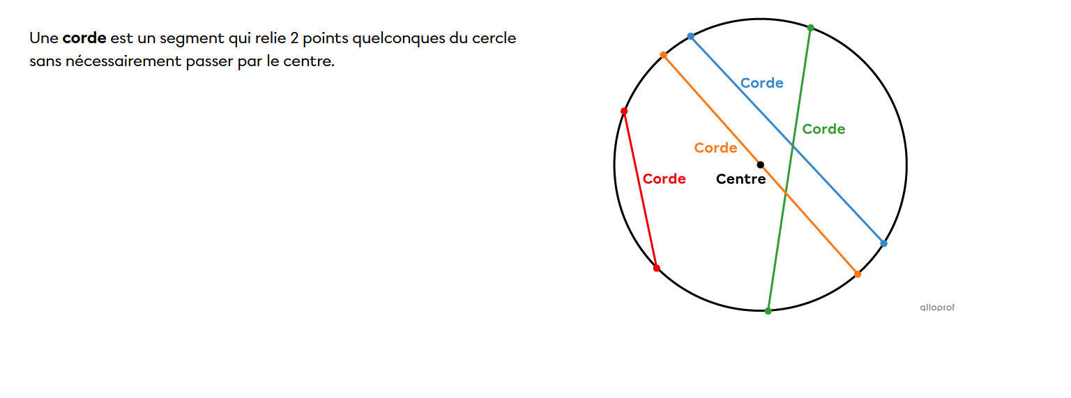 De plus, puisque le cercle est composĂ© dâune infinitĂ© de points, il contient aussi une infinitĂ© de cordes.
