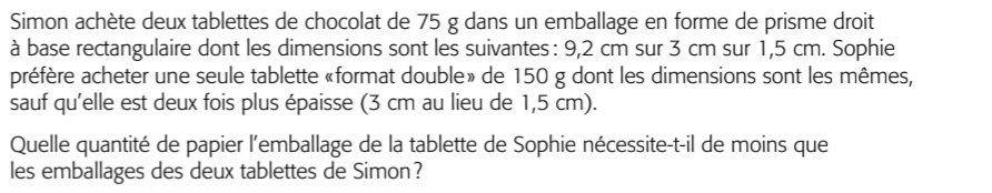 Ici, on cherche l'aire totale (emballage), pour chaque prisme. Dans un prisme à base rectangulaire, tu as deux fois chaque côté :