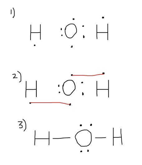 Par exemple, si nous voulons représenter une molécule de H2O avec la notation de Lewis, nous pouvons d'abord représenter individuellement les 3 atomes en jeu selon la notation de Lewis. Par la suite, on peut tracer des liens entre les électrons célibataires pour établir la structure de la molécule.