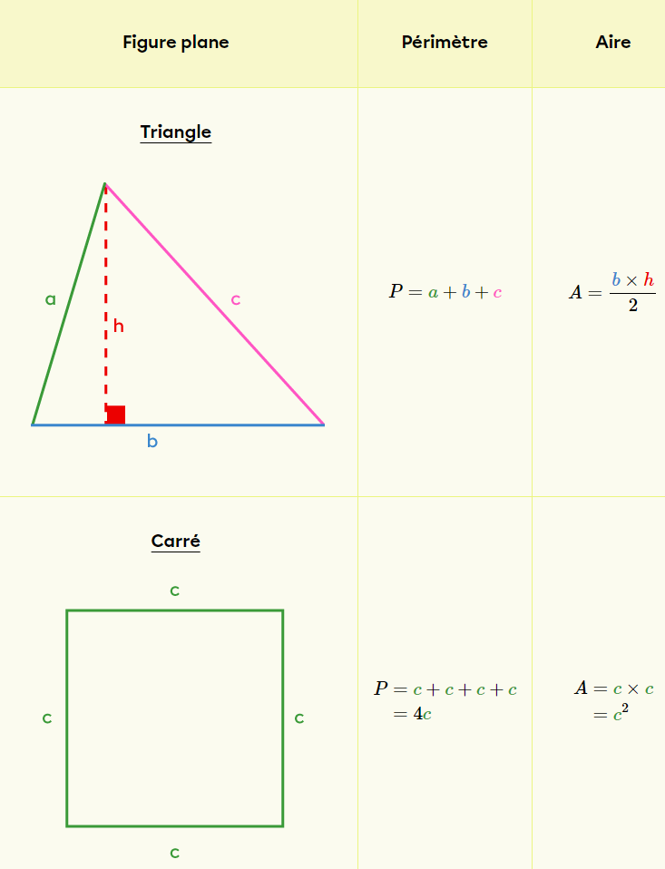 Pour compléter les réponses des utilisateurs précédents, il ne faut pas oublier que le calcul d'aire va dépendre de la figure. Pour un carré ou un rectangle, le calcul est assez simple, mais il n'est pas le même pour un triangle par exemple.
